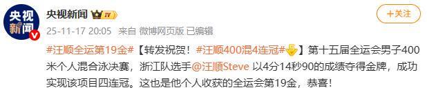 据央视新闻微博最新消息,在第十五届全运会男子400米个人混合泳决赛中,浙江队名将汪顺凭借出色发挥,以4分14秒90的优异成绩强势夺得金牌,成功实现该项目四连冠的壮举。这一成绩不仅彰显了汪顺在该项目上的绝对统治力,也让他个人全运会金牌总数达到19枚,再次刷新了自己的纪录。