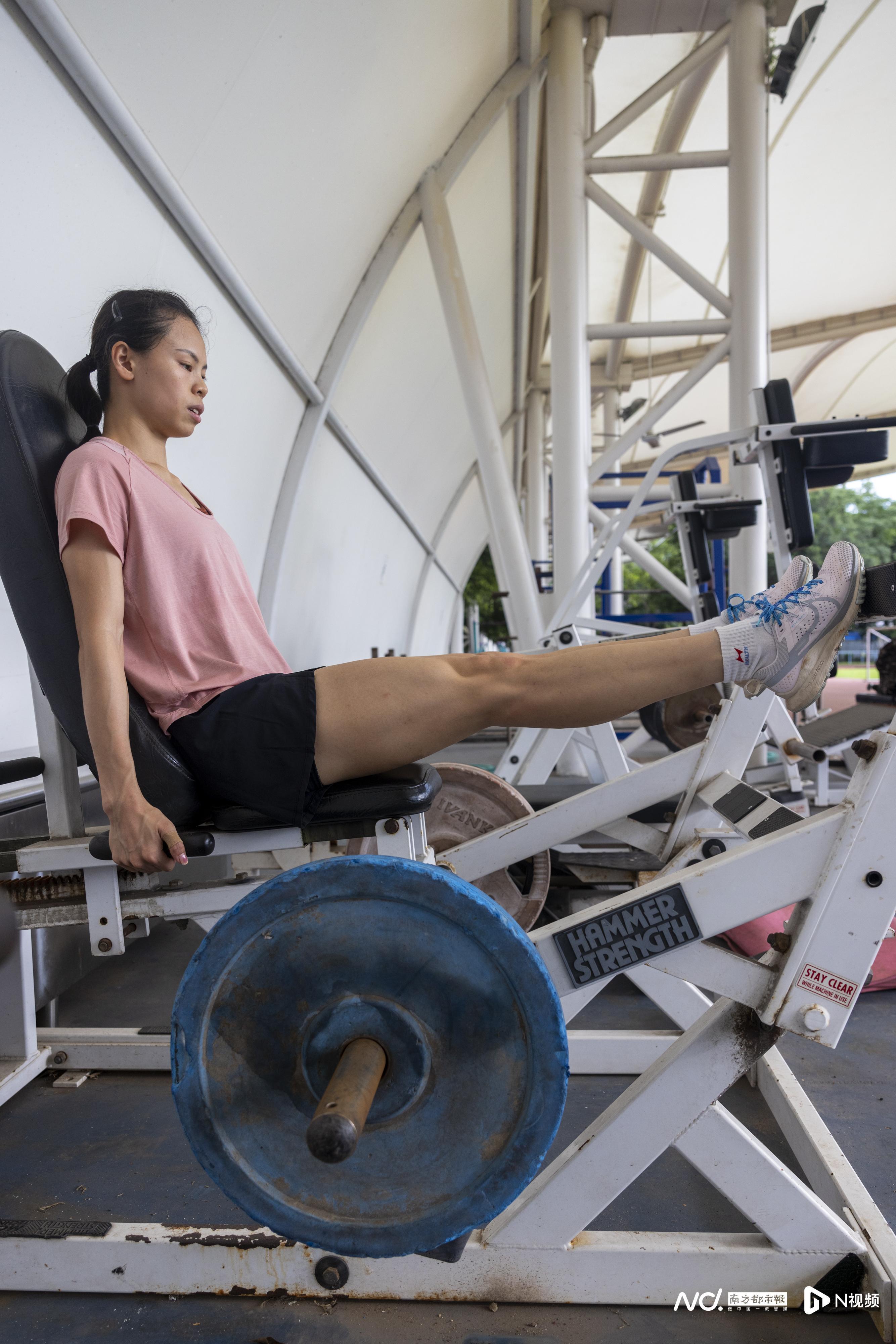 在训练场器械区,莫家蝶进行自我训练,跳起来腾空相当高。