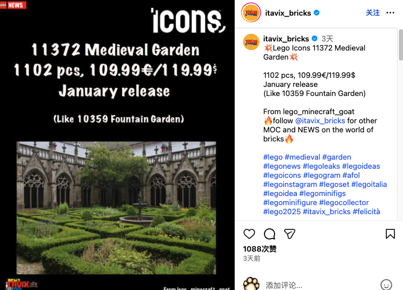 加上世界花园第一款作品10315,目前已知该系列一共有两款作品:
