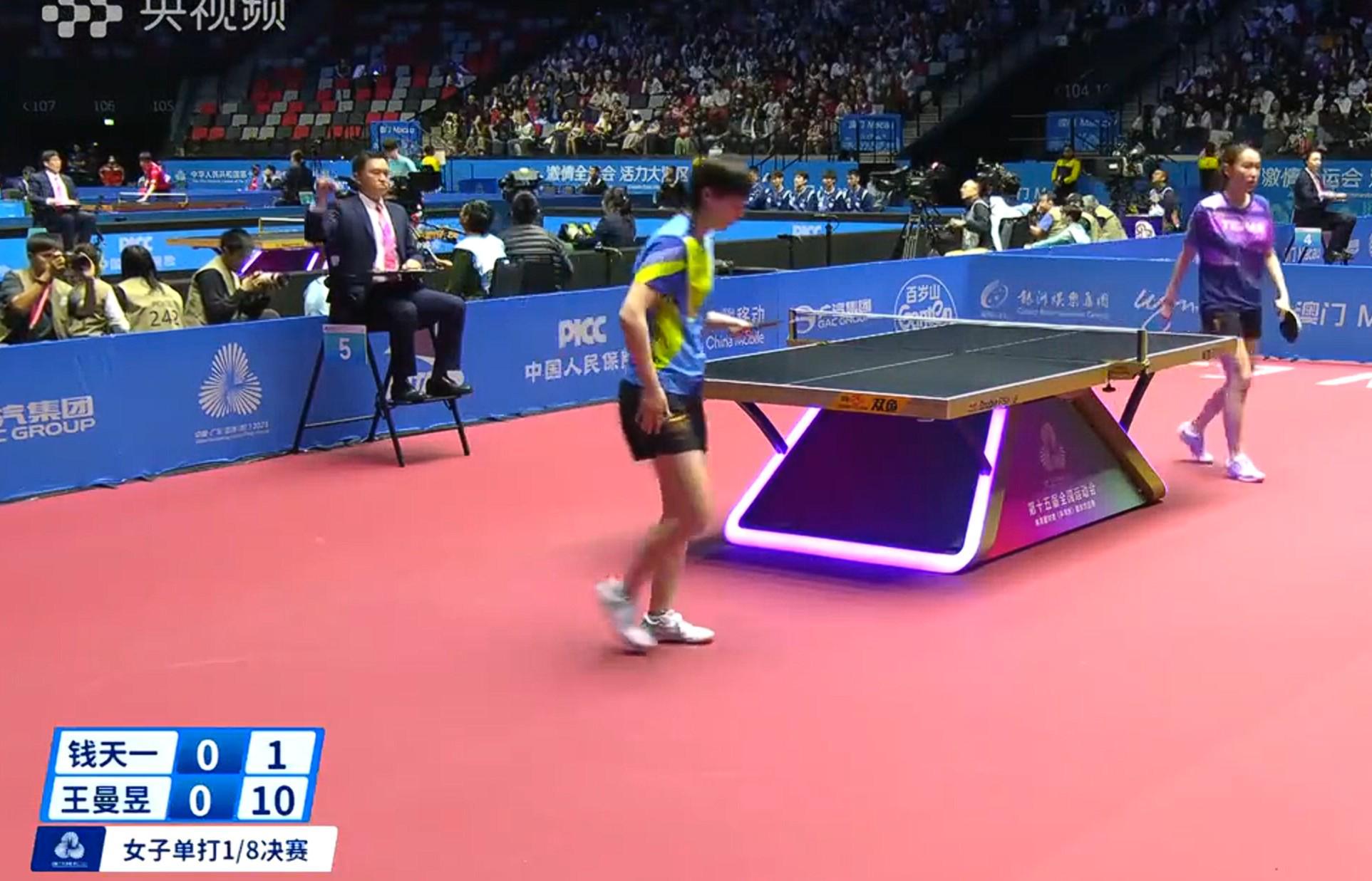 11月12日,全运会乒乓球女子单打1/8决赛迎来一场焦点对决,国乒主力选手王曼昱以4-1(11-1、11-4、11-5、10-12、13-11)的比分战胜队友钱天一,成功晋级八强。本场比赛王曼昱展现出了强大的统治力,前三局以压倒性优势连下三城,尽管第四局钱天一扳回一城,但王曼昱在决胜局顶住压力,最终以两分优势锁定胜局。