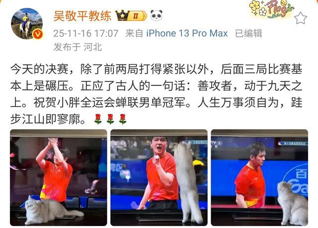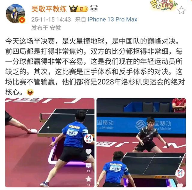 尽管樊振东的人品与格局获得一致认可,但其恩师吴敬平的赛后言论却引发争议。吴指导在社交媒体上点评决赛时表示:“前两局紧张,后三局基本碾压。”然而,在半决赛樊振东同样碾压王楚钦后,他却将那场比赛描述为“国乒巅峰对决”。这种前后矛盾的评价标准,被网友认为是对林诗栋不够尊重,甚至有些“厚此薄彼”。这一争议也再次凸显了公众对运动员评价公平性的高度关注。