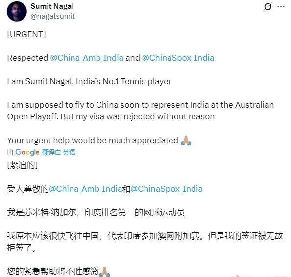 近日,一则关于印度网球选手的新闻引发了广泛关注。据外媒报道,印度网球选手前往中国参赛时遭遇签证被拒的困境,无奈之下,选手在社交媒体上向中国驻印度大使馆发出了求助信息。