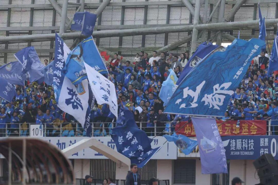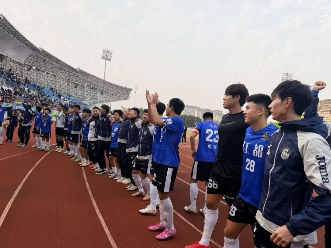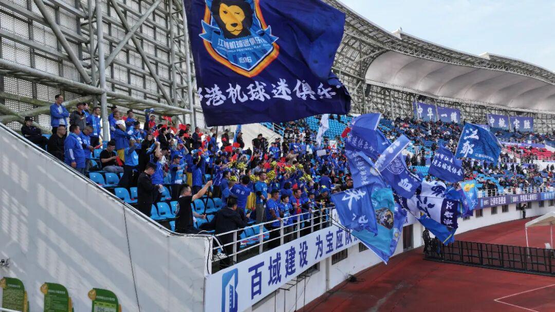 第65分钟,江都队22号高帏策从边路发起进攻,与队友通过连续一脚传递撕开防线,最终推射得手,将比分定格为3:0!此时全场沸腾,江都球迷挥舞旗帜高唱战歌,球员们冲向客队看台与球迷疯狂庆祝。