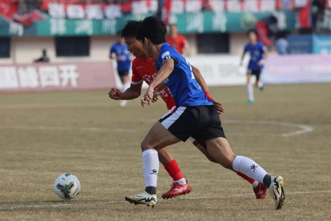 第16分钟,江都队27号马蔚然抓住对方防线漏洞,一记势大力沉的抽射直挂球门死角!这粒进球瞬间点燃全队斗志,江都队攻势如潮。易边再战,第53分钟,马蔚然再度发威,他连续突破两名防守球员后冷静推射,完成个人“梅开二度”,将比分扩大至2:0。