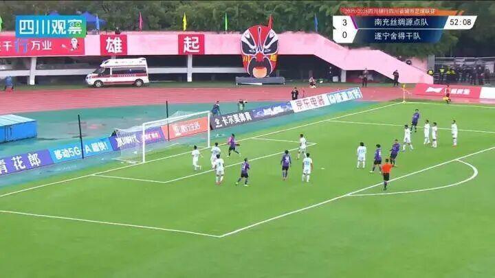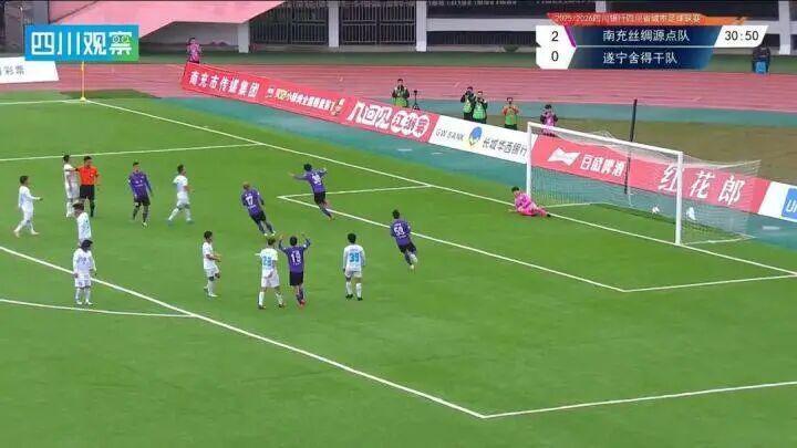 比赛第30分钟,南充队再获良机。球队球员在边路突破直插对方禁区,遂宁队防守队员情急之下犯规,裁判果断判罚点球。30号队员李毅挺身而出主罚点球,助跑后一脚劲射,皮球直窜球门死角,将比分扩大为3-0。