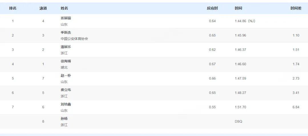 据现代快报报道,11月12日晚,第十五届全运会游泳比赛在深圳大运中心游泳馆继续进行。在备受瞩目的男子200米自由泳决赛中,张展硕凭借出色发挥斩获冠军,季新杰紧随其后获得亚军,潘展乐则位列季军。然而,本场比赛的一大焦点——孙杨,却因抢跳违规,成绩被显示为DSQ(取消比赛资格),最终位列第八。