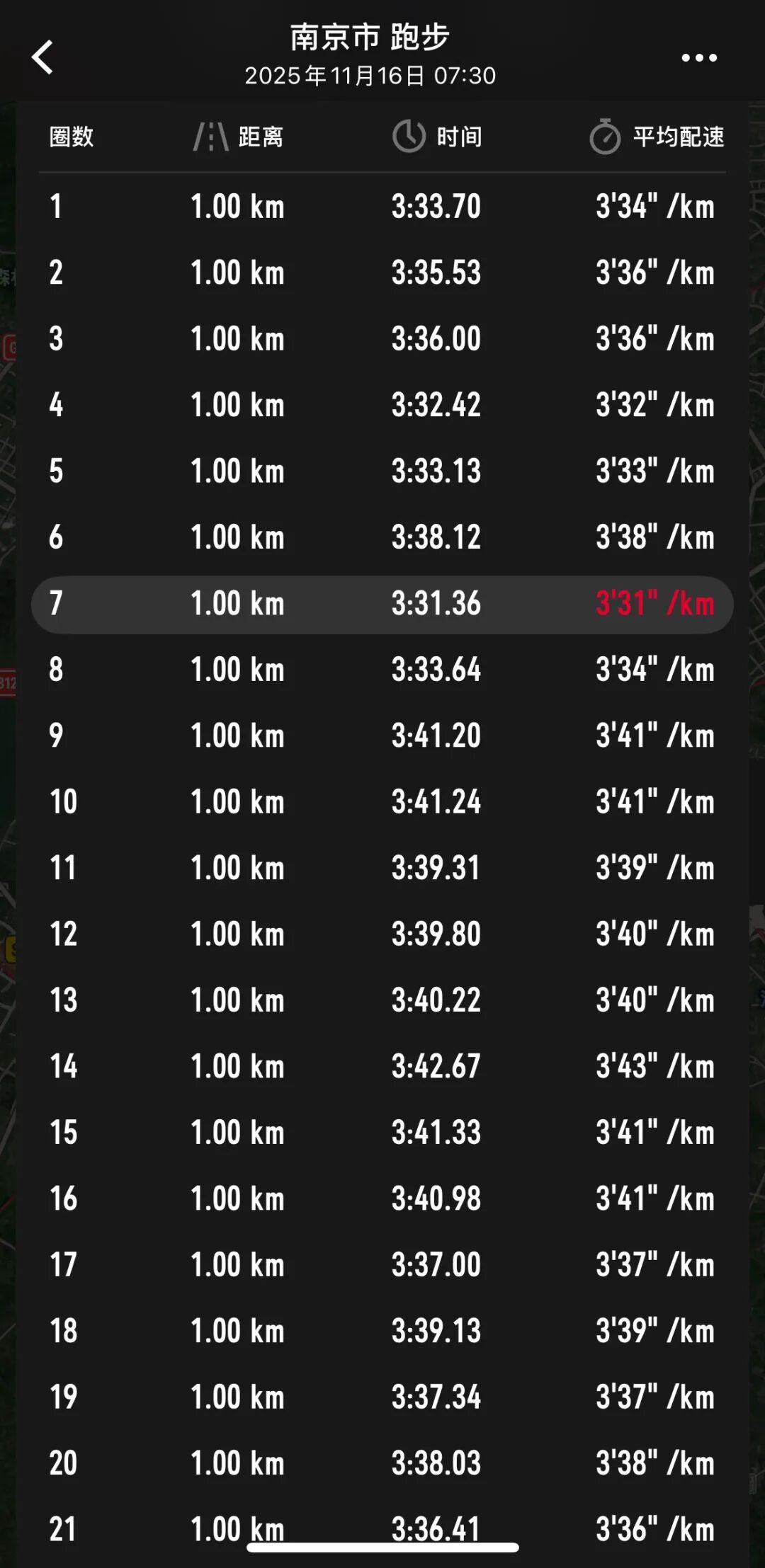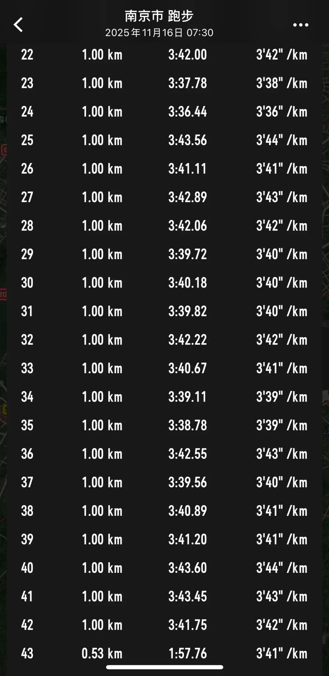 本以为赛前自己尾号777的号码布为她带来两瓶海之蓝是个幸运的开始,但比赛当天早上,离开酒店前就拉了两次的肚子好像就此埋下了“意外”的兆头——前15公里,小美跑得很舒服,但是16公里到玄武湖边的时候,一股隐隐不适的感觉从肚子传来,自此,她也开启了“去上厕所还是再忍忍”的左右互搏之中。配速也一度掉到了410开外。