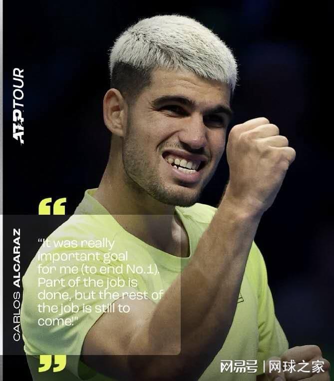 现在,阿尔卡拉斯在2025年都灵ATP年终总决赛小组赛中,一胜连续两年闯进年终总决赛的澳大利亚小野兔德-米纳尔,再胜去年年终总决赛亚军、美国奶爸弗里茨,三胜首次闯进年终总决赛的意大利单反天才穆塞蒂,成功夺取了2025年ATP年终世界第一,如愿实现了第一个目标。正如阿尔卡拉斯昨天凌晨赛后接受现场采访时所说:“我的第一项工作任务已经完成了,但是后面还有工作要做。”这就是瞄准第二个目标,积极备战半决赛。