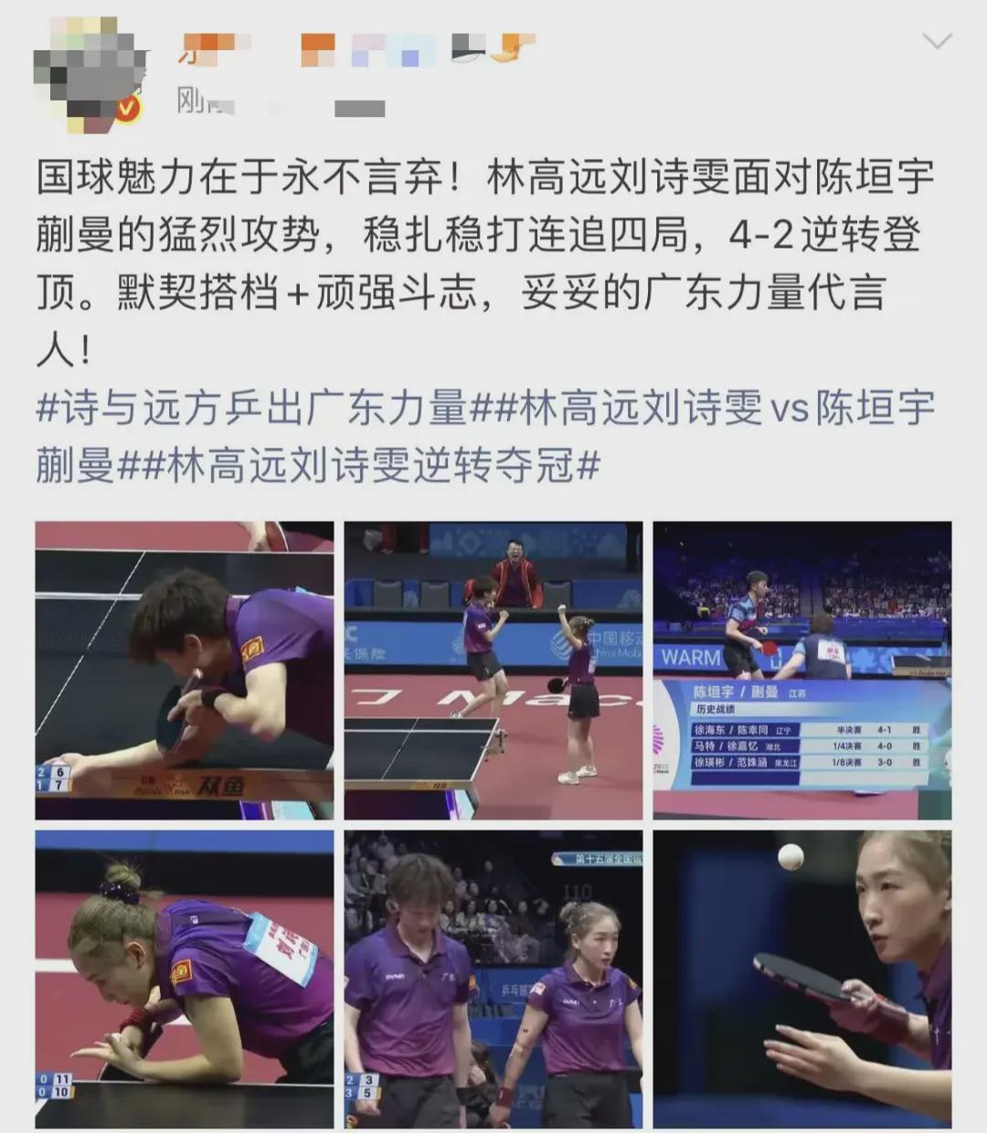 让我们再次恭喜林高远、刘诗雯组合夺冠!同时也为陈垣宇、蒯曼等年轻选手的精彩表现喝彩!期待他们在后续比赛中带来更多惊喜!