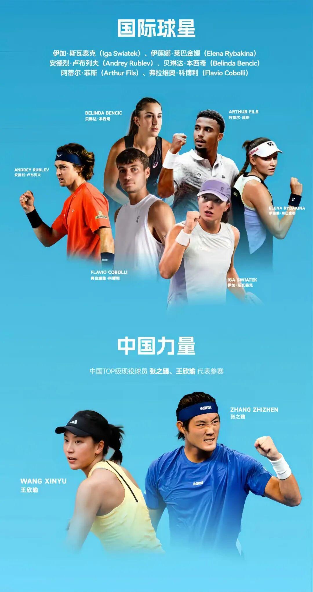 参赛阵容堪称豪华:欧洲队由六届大满贯冠军得主、波兰名将斯瓦泰克领衔,瑞士“公主”本西奇、法国新星菲斯、意大利新锐科博利组队出战;世界队则集结了中国首个奥运会网球混双银牌组合王欣瑜/张之臻、哈萨克斯坦“冰美人”莱巴金娜(世界排名第九)以及两届大师赛冠军卢布列夫(俄罗斯),东西方网球力量首次正面交锋!