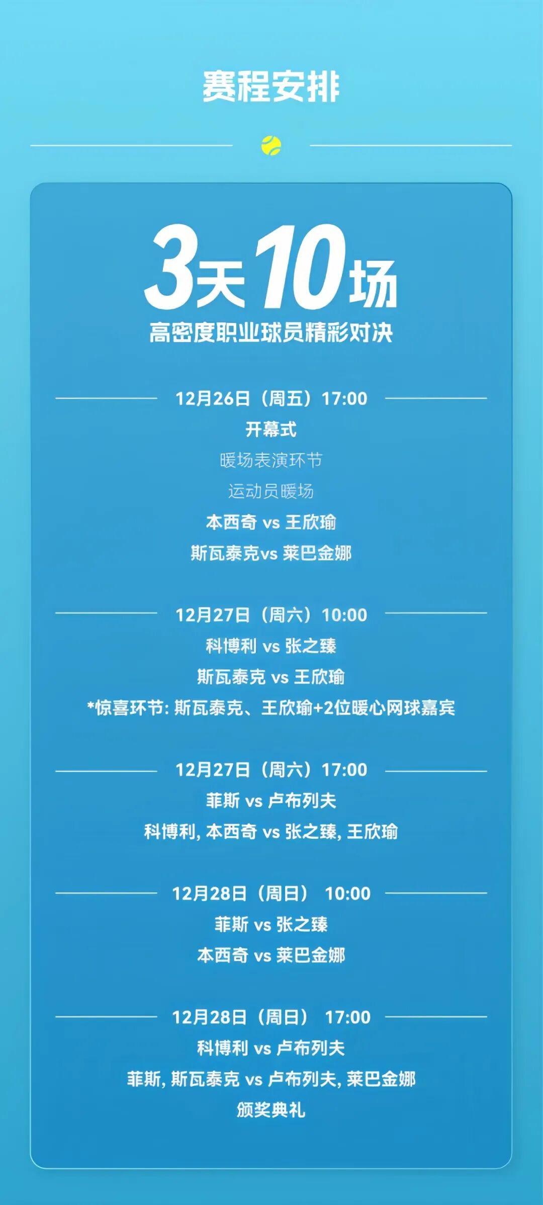 从12月26日开幕式到28日决赛日,赛事将连续三天上演精彩对决:每日安排3-4场比赛,涵盖单打与双打项目,确保球迷每天都能见证巅峰对抗。赛程设计兼顾竞技性与观赏性,既有单打选手的个人英雄主义,也有双打组合的默契配合,更有团体赛的排兵布阵策略较量。
