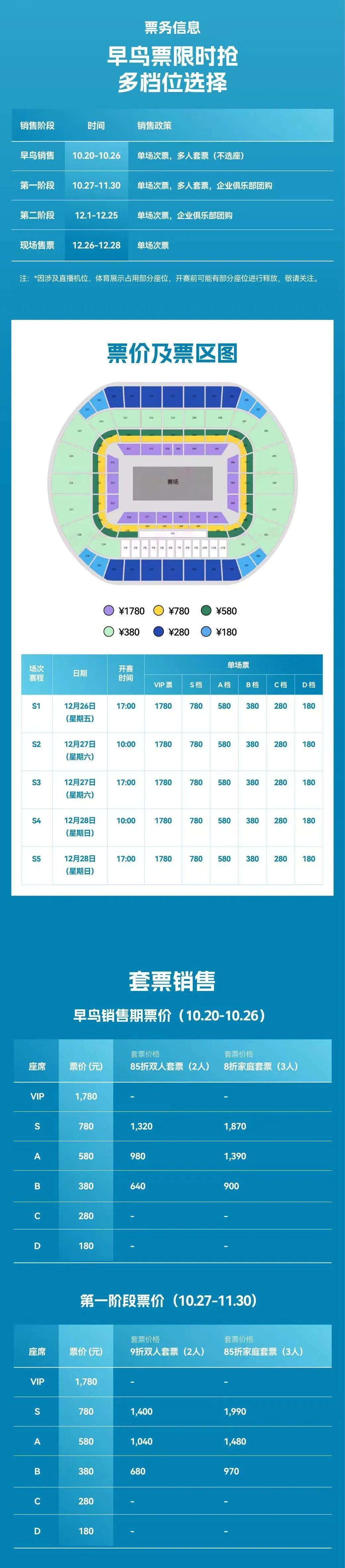 为满足不同观众的观赛需求,赛事设置VIP套票、单日票、亲子票等多种票种。即日起可通过官方渠道购票,早鸟票享受限时优惠。现场更设球迷互动区、签名会等福利环节,近距离接触偶像不是梦!