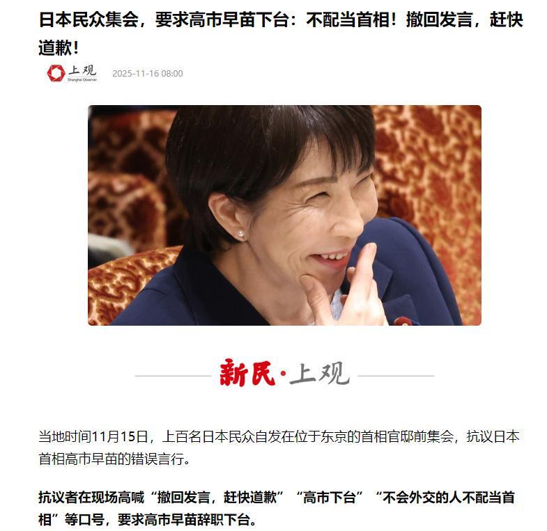 在短短24小时内,中方对日本连续采取了四大举措,彰显强硬立场。先是外交部召见日本驻华大使金杉宪治,表达严正关切;紧接着,中国驻日大使也奉示约见了日本外务事务次官,进一步传递中方态度。同时,解放军舰队已抵近日本附近海域,进行实战化演练,国防部更是直接下达了“若日本胆敢武力介入台海,必将在解放军的铜墙铁壁下头破血流”的最后通牒。而在日本国内,舆论也出现了巨大变化,多名政治人物纷纷抨击高市早苗的涉台错误言论,日本民众更是于11月15日围堵首相官邸,要求高市立刻撤回言论,并直言“搞不好外交就下台”!此外,日本的“西方盟友”也无一站出来力挺高市早苗,使其陷入“四面楚歌”的境地。