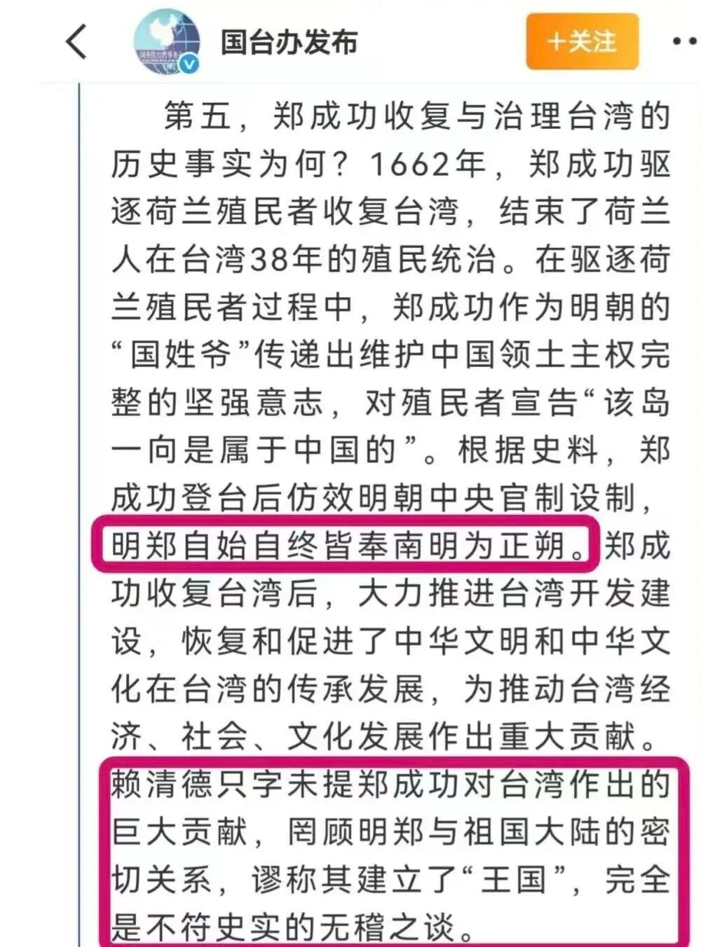 赖清德曾称郑成功是台湾“东宁王朝的开国君王”,以此为“台独”寻找法理依据和历史依据。但包括国台办在内的我国权威机构多次斥责赖清德的谎言,明确指出:历史上不曾存在过“东宁王朝”、“东宁王国”或者说“东宁政权”,台湾郑氏集团一直奉大明天子为正统,用“永历年号”,自认为“中华正统王朝的臣子”,“作为中华正统王朝的臣子所占据的台湾是中华领土的一部分”。