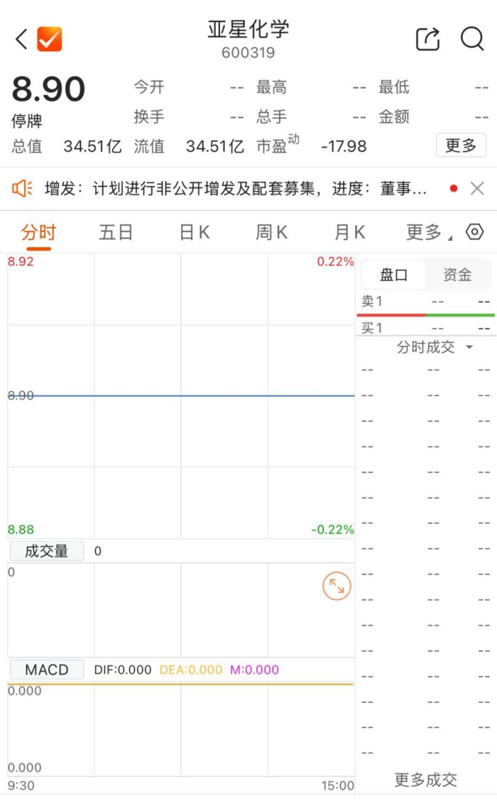 亚星化学于11月4日起开始停牌,停牌前每股报8.9元,总市值为34.51亿元。