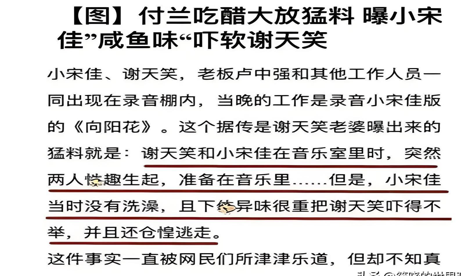 谢天笑的妻子后来在接受采访时调侃了一句:“宋佳有股咸鱼味,把老谢熏跑了。”