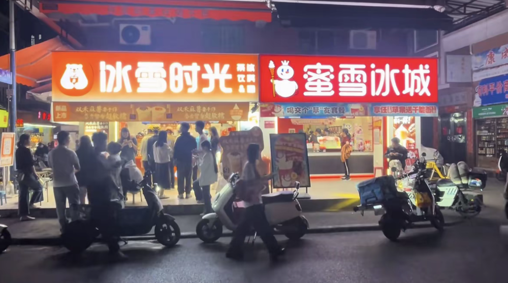明明街对面就是一家高中,但果汁店仍然无人光顾。其实谜底就在谜面上,在镜头一闪而过的角落里,一家红色的蜜雪冰城排起了长队。