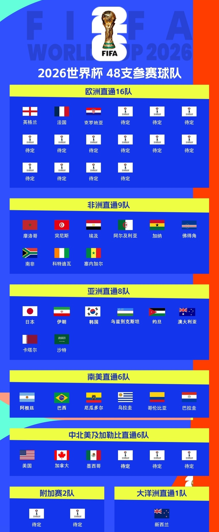 亚洲区:日本、伊朗、韩国、约旦、澳大利亚、卡塔尔、沙特、乌兹别克斯坦