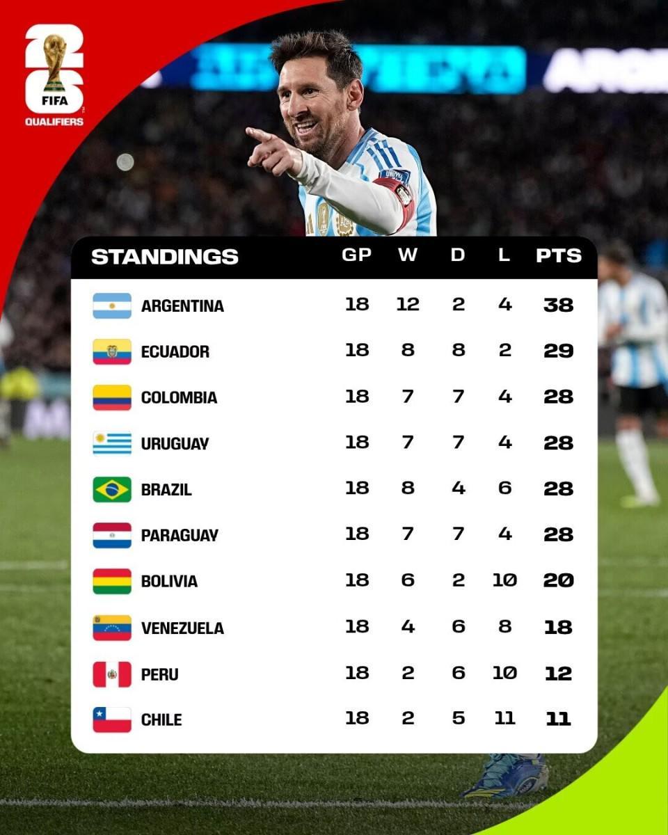 南美区预选赛前6名直接晋级世界杯,第7名将参加洲际附加赛。最终排名如下: