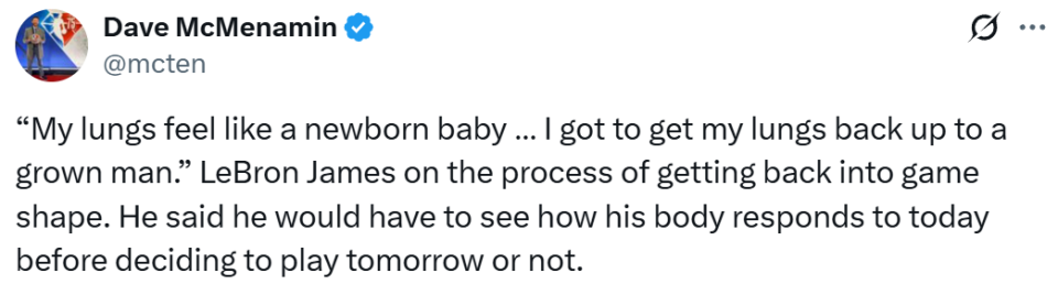对于当前的身体感受,詹姆斯用生动的比喻形容:“我的肺现在感觉像新生儿的一样——这是最关键的一点。我得让它恢复到成年人的状态。”他笑着补充道,回归首日因忙于喊战术、布置任务,嗓子已哑,今晚需多喝茶、好好休息以适应强度。关于明日是否出战,他表示将根据今日身体反应再做决定,并强调:“恢复到成年人的体能水平,只有通过上场比赛才能实现。”