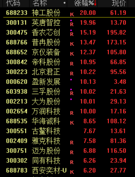 券商等金融股午后拉升,东北证券涨停;化工股延续强势,鲁西化工、澄星股份等封板;存储芯片板块反复活跃,大为股份、万润科技等涨停。下跌方面,机器人概念股调整,浙江荣泰跌停。