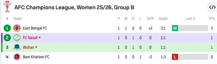 本轮过后,B组积分榜如下:印度东孟加拉1胜积3分领跑,武汉女足与纳萨夫同积1分分列二三位,伊朗巴姆卡通0分垫底。根据规则,12支参赛队分为3组,每组前两名及两支成绩最好的小组第三晋级淘汰赛,四分之一决赛将于2026年3月通过抽签决定对阵。