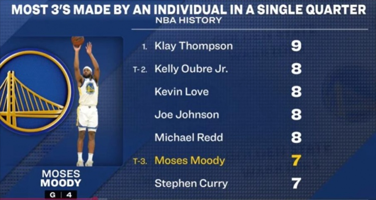 穆迪全场三分球12投8中,豪取32分,主要的高光镜头都集中在了第一节。首发出场的他单枪匹马扔进7记三分球,单节独得21分,为比赛奠定了基调。如此一来,穆迪也是成为了继库里、汤普森之后,勇士队第三位能在单节扔进7记三分球的球员,水花后继有人。哪怕放眼整个NBA历史,穆迪的表现也是现象级的:克莱单节9记三分球独一档,乐福、乌布雷、乔-约翰逊、迈克尔-里德都曾单节投进8记三分球,穆迪和库里并列排在第三档。