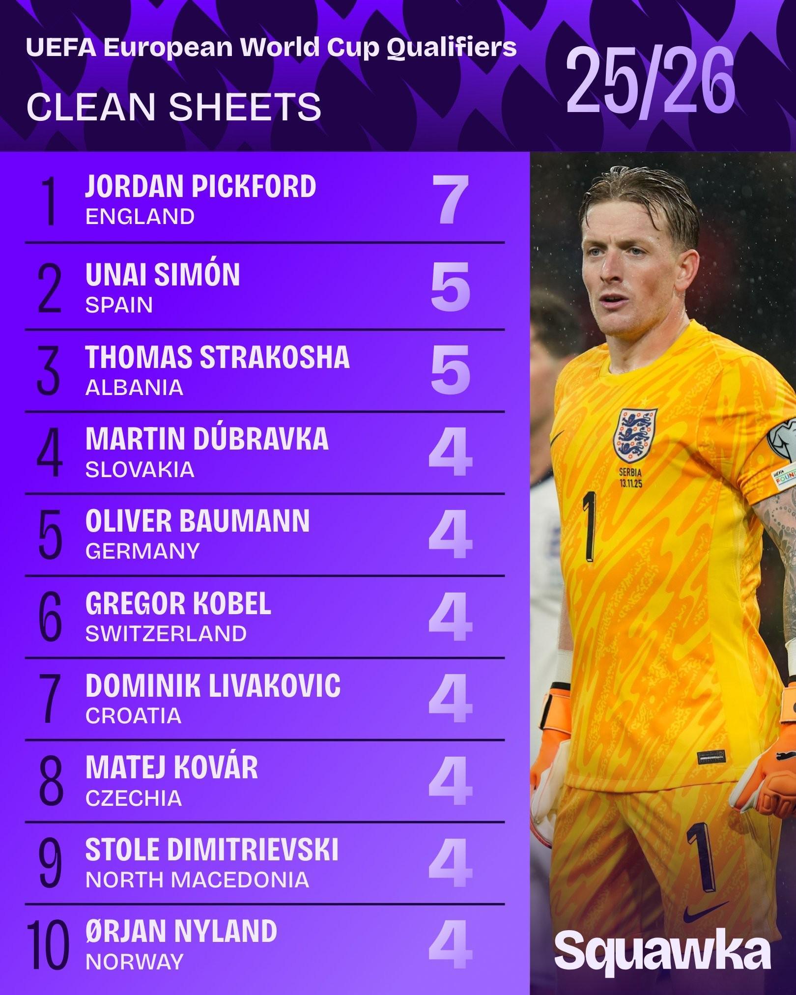 作为英格兰国家队的主力门将,皮克福德在本届预选赛中展现了极强的防守稳定性,7次零封对手的表现不仅帮助球队提前锁定出线资格,也让他成为目前欧洲区预选赛零封次数最多的门将。