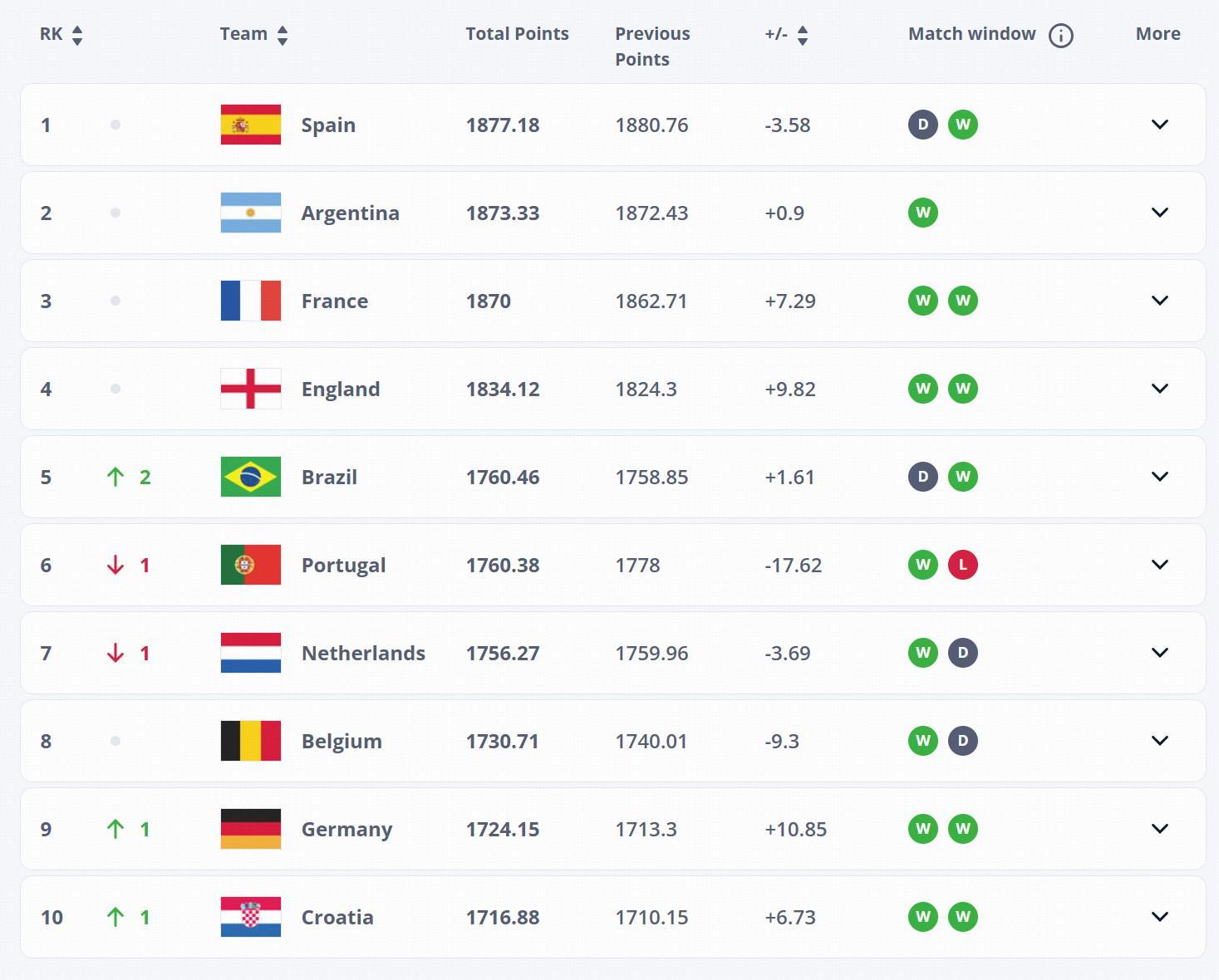 在本期排名中,西班牙队继续保持领先地位,展现出强大的实力和稳定性。阿根廷和法国紧随其后,分列第二和第三,这三支球队无疑是当前世界足坛的顶尖力量。英格兰、巴西、葡萄牙、荷兰、比利时、德国和克罗地亚则分别占据了第四至第十的位置,这些球队同样具备不俗的竞争力。