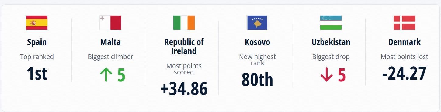 在本期排名更新中,除了前十球队的稳定表现外,还有一些球队的排名发生了显著变化。其中,马耳他队上升名次最多,一口气提升了5位;而乌兹别克斯坦队则下降名次最多,同样下降了5位。这些变化反映了国际足坛的竞争激烈程度,任何一支球队都不能掉以轻心。