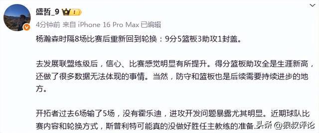 同时,盛哲也指出了开拓者队目前存在的问题:“开拓者过去6场输了5场,没有霍乐迪,进攻开发问题暴露尤其明显。近期球队比赛内容和轮换方式,斯普利特可能真的没做好胜任主教练的准备…”