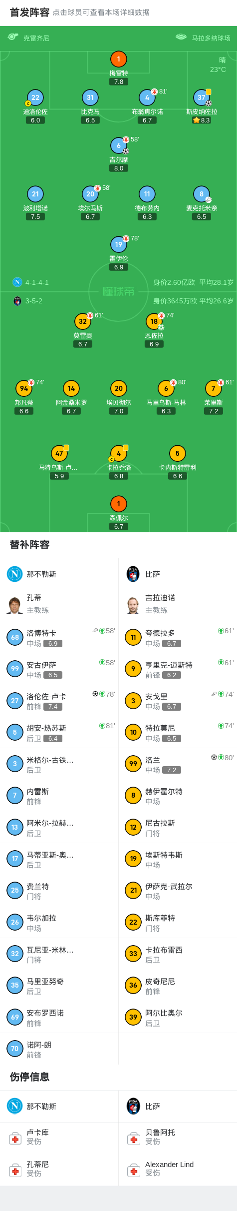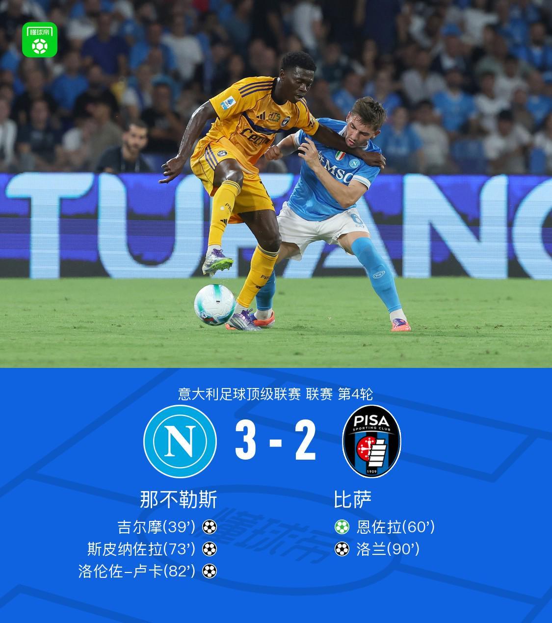 北京时间9月23日,2025/26赛季意甲联赛第4轮迎来一场焦点对决,那不勒斯坐镇马拉多纳球场迎战比萨。最终凭借吉尔摩、斯皮纳佐拉和洛伦佐-卢卡的进球,主队3-2惊险获胜,取得联赛四连胜。