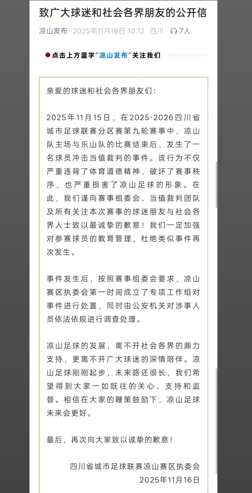 事件发生后,凉山赛区组委会迅速发布道歉声明,承认该行为严重损害了川超联赛形象,也给凉山地区声誉带来负面影响。有分析指出,此类暴力事件不仅需要大量时间和资源修复形象,更可能成为长期伴随凉山队的负面标签,影响地区体育事业发展。