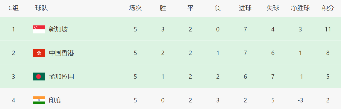 同组另外一场比赛,印度队客场0 - 1不敌孟加拉国队,这样5轮积2分的印度队提前一轮锁定小组垫底。