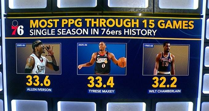 据赛后数据统计,马克西在本赛季前15场比赛中展现出了惊人的得分能力,场均得分高达33.4分。这一数据在76人队历史上能够排在第二位,成功超越了传奇球星威尔特-张伯伦在队史上的32.2分纪录,仅次于另一位传奇球星阿伦-艾弗森的33.6分。马克西的出色表现,无疑为76人队的进攻端注入了强大的火力。