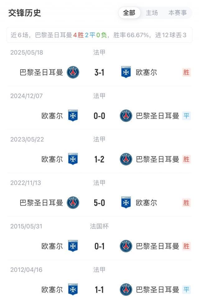 从历史交锋记录来看,巴黎圣日耳曼对阵欧塞尔已经连续7场不败(5胜2平),占据着明显的心理优势。本场比赛,巴黎能否延续这一良好势头,值得球迷们期待。