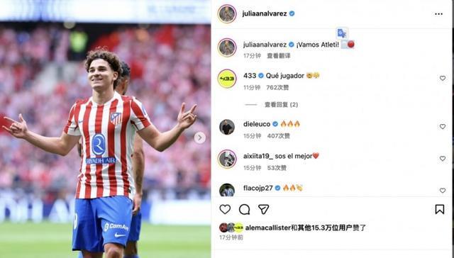 赛后阿尔瓦雷斯通过个人社交媒体发布庆祝动态,配文"加油,马竞!⚪️"并附上比赛精彩瞬间。这是阿根廷人本赛季西甲第5次首发打入的第4粒进球,其效率远超同期表现。数据显示,阿尔瓦雷斯本场跑动距离达11.2公里,3次成功过人全部转化为射门机会。
