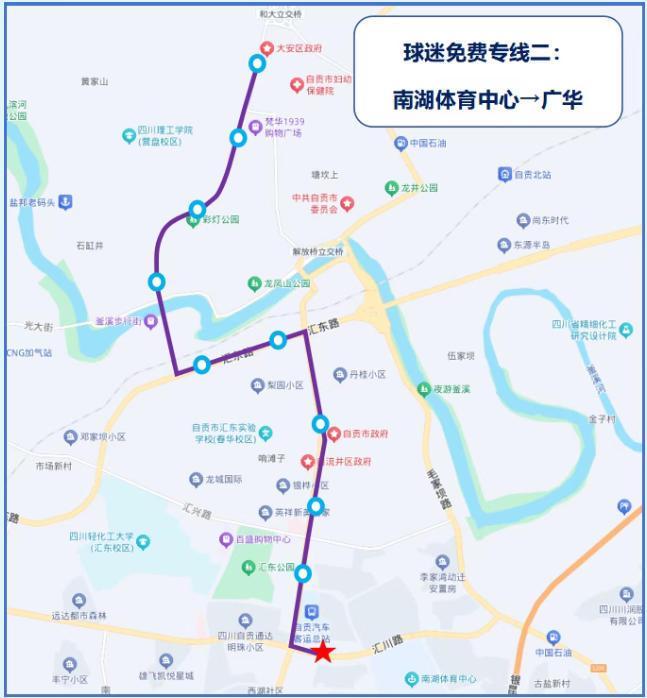 据自贡市公交集团9月30日通报,为倡导绿色观赛理念,10月1日当天持当日球票票根的观众,可免费乘坐全市所有公交线路。特别在散场时段(约21:30后),将开通4条定制专线: