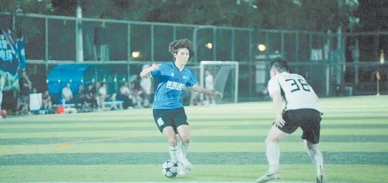 △大湾区湖南人队队员(蓝衣)在热身赛中
