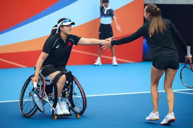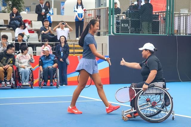 “一站一坐”表演赛成为整场活动的高潮。黄惠敏与邵羽杉组成“中青组合”,对战亚历山德拉·克鲁尼奇与马梓茜的“中外组合”。根据规则,轮椅运动员允许球两跳,站立运动员则为一跳。在比赛中,四位运动员不分国籍、不论“站与坐”,只以网球对话。轮椅运动员灵活地移动与精准击球,站立运动员的奔跑与协作,共同勾勒出体育最美的模样。