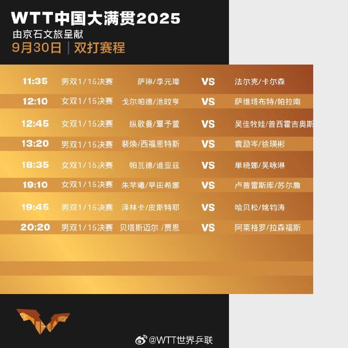 2025年WTT中国大满贯赛事持续火热进行中,9月30日的精彩对决继续在石景山首钢园激情上演。备受瞩目的“莎头组合”将强势出战混双项目,为观众带来一场场扣人心弦的比赛。以下是当日的详细赛程安排: