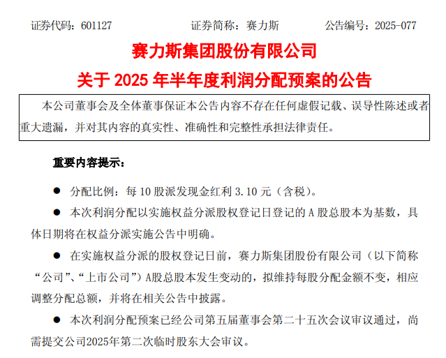 赛力斯在公告中强调,公司2025年度半年度利润分配预案尚需提交2025年第二次临时股东大会审议。