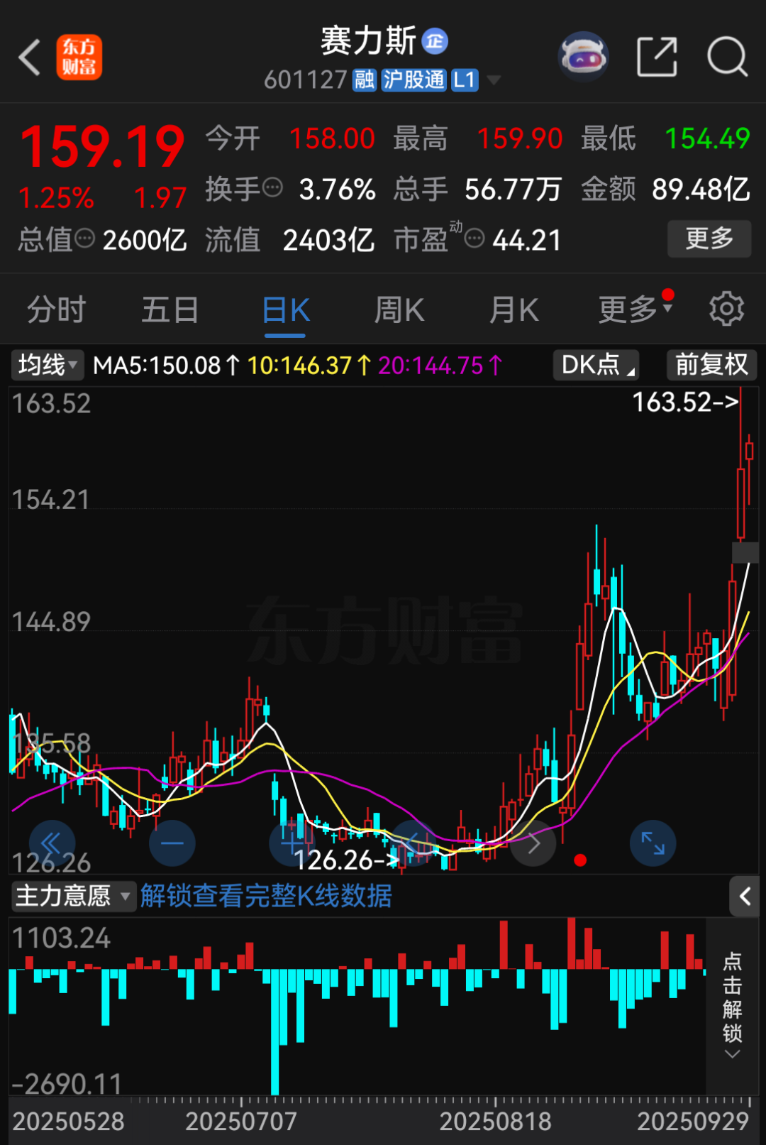 截至9月29日收盘,赛力斯股价报159.19元/股,涨幅达1.25%,总市值为2600亿元,显示出市场对赛力斯未来发展的积极预期。