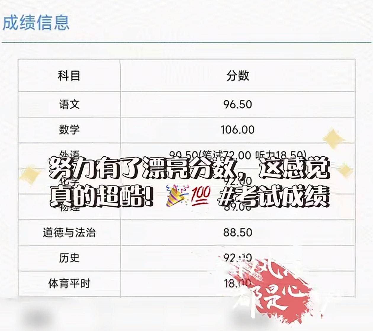 7月份,母亲晒出了儿子的中考成绩。虽然不是特别高的分数,但也是他自己努力的结果,这让母亲感到非常自豪。
