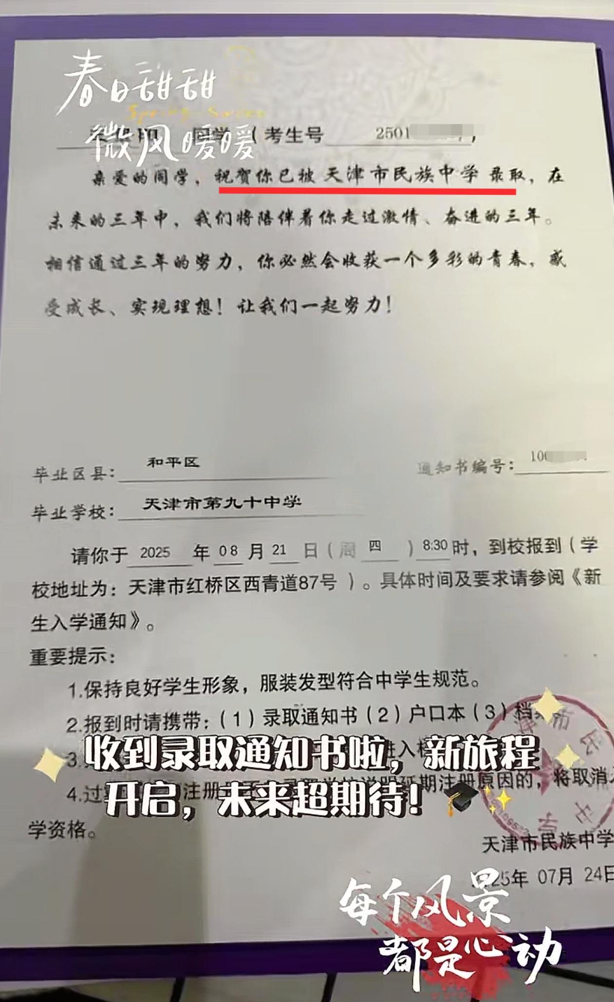 从母亲7月份公开的录取通知书来看,王景阳在今年的中考中被天津的一所重点中学录取,8月21日报到。然而,没想到读高一还不到一个月,他就离开了这个世界。