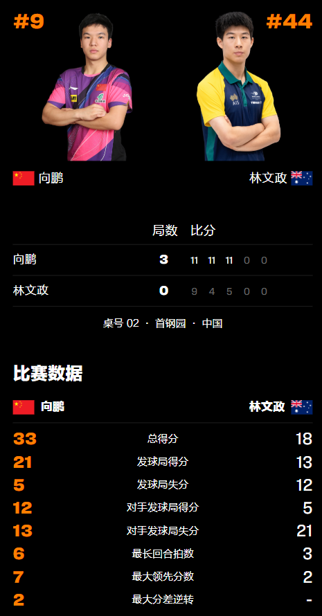 回顾两人过往的交手记录,向鹏在国际赛场上两次遇到林文政均取得了胜利。特别是在上赛季的中国大满贯上,向鹏曾以3-0的比分干净利落地横扫对手晋级。时隔一年,在同样的赛事中再度相遇,向鹏能否延续强势表现成为了此战的最大看点。