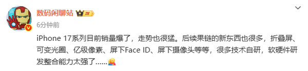 【CNMO科技消息】近日,苹果最新发布的iPhone 17系列在市场上展现出了强劲的表现,销量持续攀升,走势迅猛,引发了业界的广泛关注。
