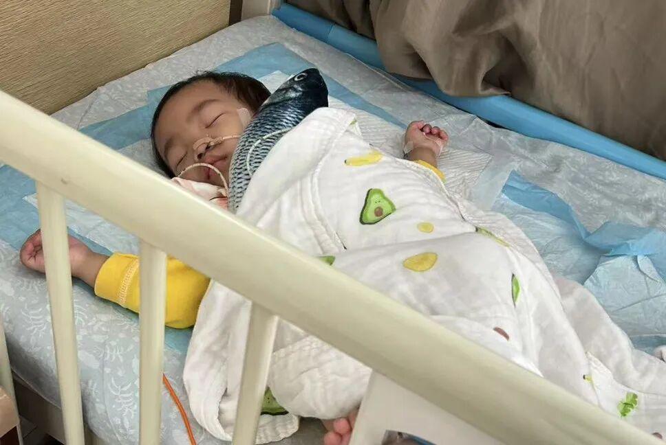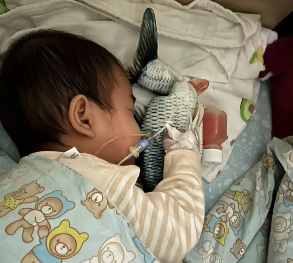 第二次手术后,女儿仅剩30多厘米肠道。剧烈疼痛让她整日哭闹,只能抱着玩偶鱼入睡。尽管精心护理,还是逃不开第三次切肠的命运。