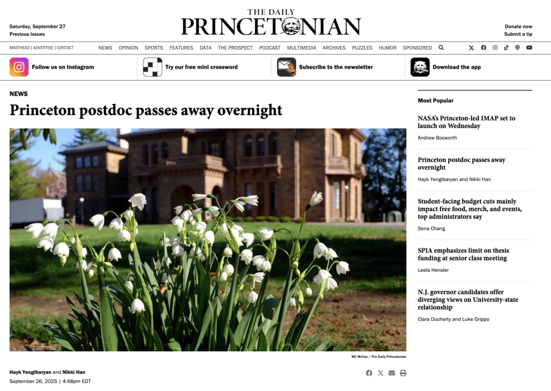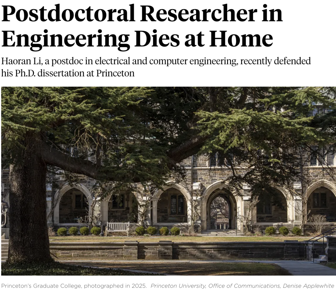 2025年9月26日,美国著名高等学府普林斯顿大学向全校师生及教职员工发布了一则令人痛心的通报:电子与计算机工程研究领域的博士后研究员李昊然(Haoran Li,音译)于2025年9月25日晚在其位于新泽西州韦斯特温莎(West Windsor)的住所中不幸去世。