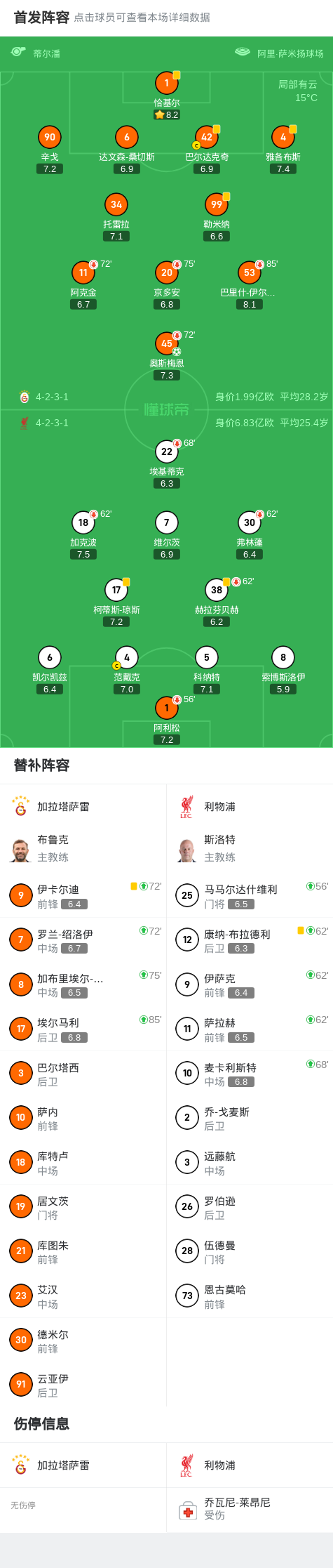 比赛伊始,双方就展开激烈对攻。第4分钟,加拉塔萨雷球员伊尔马兹获得单刀机会,但他的捅射被利物浦门将阿利松神勇挡出。